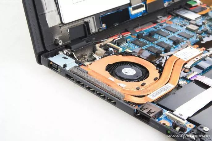 除了上述風扇+熱管(銅)+散熱鰭片“三大件”以外,輕薄本出風口的開孔位置也非常重要。為了盡可能實現瘦身,如今輕薄本大都采用下沉式轉軸,周邊接口布局在機身兩側,而出風口就只能放在轉軸內側了。