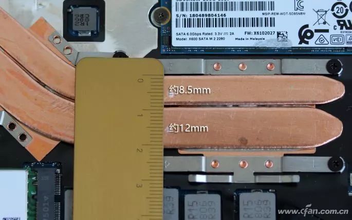 對輕薄本而言,熱管的數量并非越多越好。影響熱管導熱效率的關鍵還是橫截面積,采用1根12mm寬的熱管,其導熱效率與2根6mm寬的熱管相差無幾。