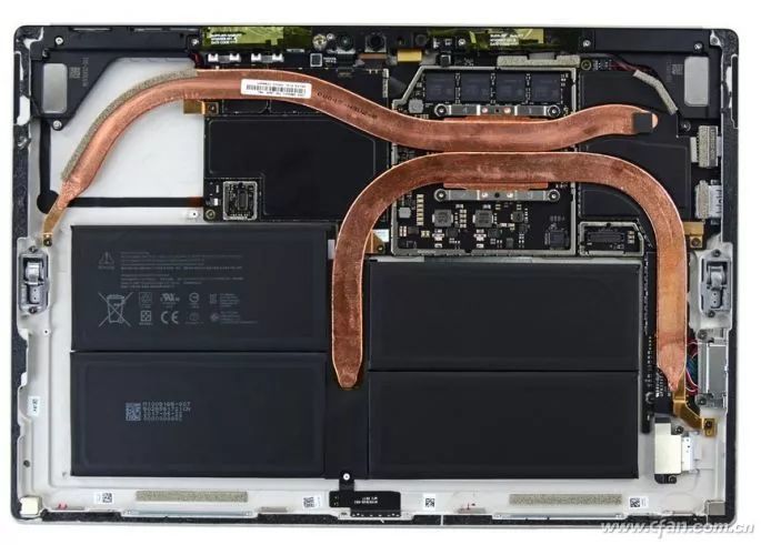 從New Surface Pro的拆機圖分析,這款產品為處理器準備了2根又長又粗的熱管,其中1根為波浪型,另外1根為U型,它們將CPU產生的熱量散布到更大的面積上,讓整個金屬材質的后蓋都充當了“散熱鰭片”的角色。
