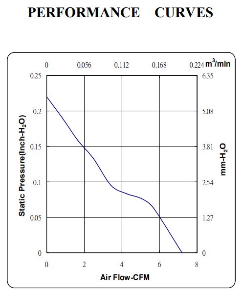 Size (mm) Air Flow (CFM) Size (mm) Air Flow (CFM) 17x17x8 0.7 ~ 0.9 60x60x15 10.8 ~ 21.0 20x20x8 1.3 ~ 1.6 60x60x20 16.0 ~ 30.5 20x20x10 1.5 ~ 1.9