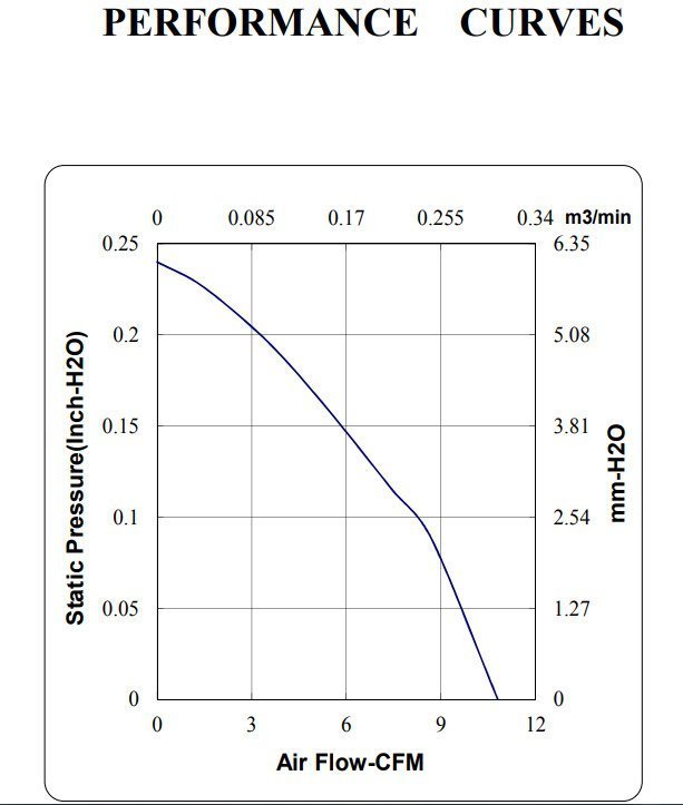Size (mm) Air Flow (CFM) Size (mm) Air Flow (CFM) 60x60x25 17.5 ~ 18 120x120x38 70 ~ 124 70x70x25 28 ~ 29 171x151x51 80 ~ 239 80x80x25 40 ~ 41