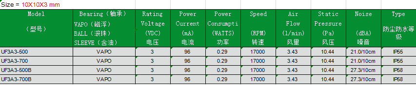 Size (mm) Air Flow (CFM) Size (mm) Air Flow (CFM) 17x17x8 0.7 ~ 0.9 60x60x15 10.8 ~ 21.0 20x20x8 1.3 ~ 1.6 60x60x20 16.0 ~ 30.5 20x20x10 1.5 ~ 1.9